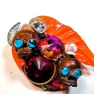 Wendy Gell Halloween pin two wood skulls orange leaves and Swarovski Stones.