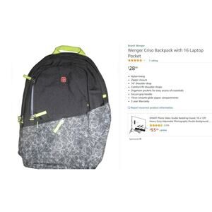 Attractive back-to-school or work backpack from Wenger. Well-constructed quality and nicely padded for laptops and easy toting of all your electronic accessories. Pockets inside and outside, plus a keeper for keys. Overall, stylish. 16" main interior pocket.