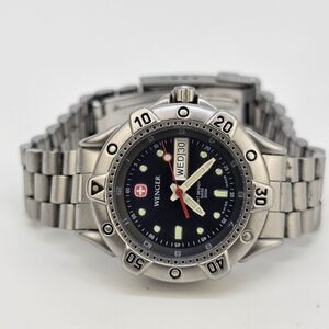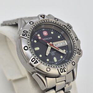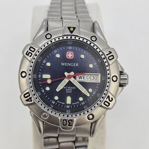 Wenger Women's Diver Watch 30MM Blue Dial Day Date Gray Bracelet 6" New Battery