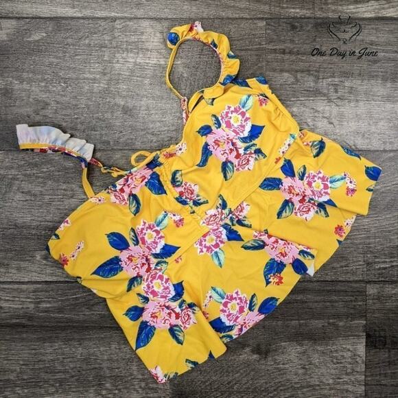 A sunny yellow tankini with frills and flair, adorned with flowers so bright and rare! This ruffled wonder is ready to shine, perfect for beach days when the weather's fine.