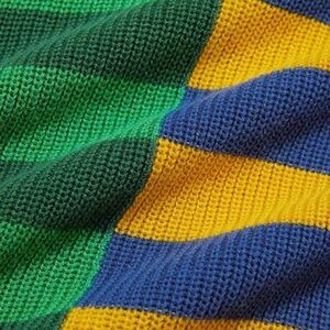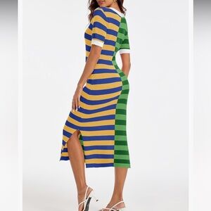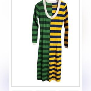 Vibrant striped dress featuring bold green, blue, and yellow colors. Perfect for making a statement.