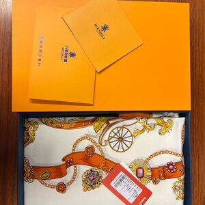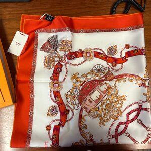 New, unworn Wensli silk scarf. In original box with tag (see pictures). Reversable, one side orange one side red/pink.