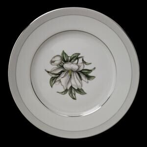 These feature a soft white magnolia floral design with green leaves and silver trim on fine porcelain — elegant and timeless.