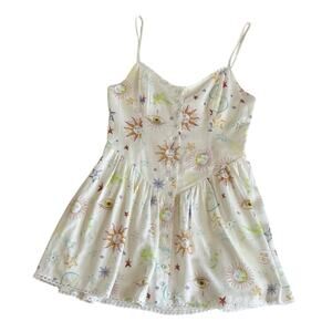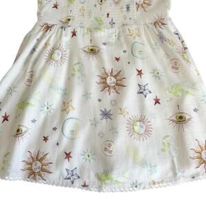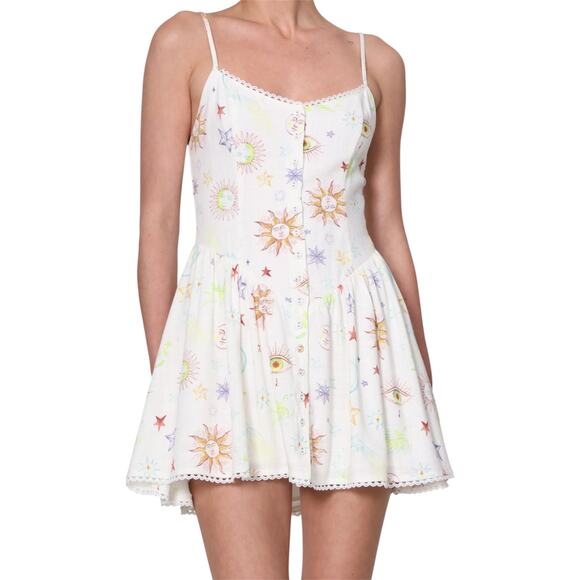 Features: We’re All Pretty Girls In My Orbit Galaxy Print Mini Dress; this white mini dress features a playful button down design, all over galaxy print with moons, suns and stars. Smocked back, adjustable spaghetti straps, lace trim bottom.