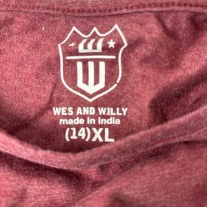 Description: Wes and Willy Florida State Seminoles t-shirt in maroon with gold "Florida State Seminoles" text and team logo. Girls size XL (14) with short sleeves and crew neck styling. Measurements approximately 15" pit to pit, 22" length. Perfect for young FSU fans to show school spirit.