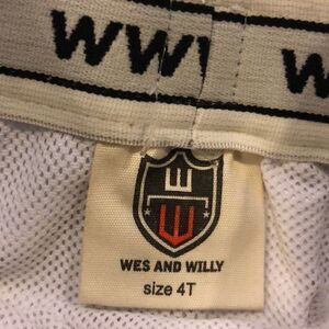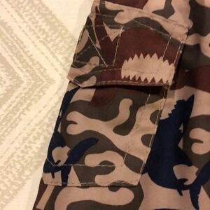 We and Willy toddler boys bathing suit. Shades of brown with navy blue & dark brown sharks. One pocket. Drawstring neon tie. NWT. Size 4T. RW.