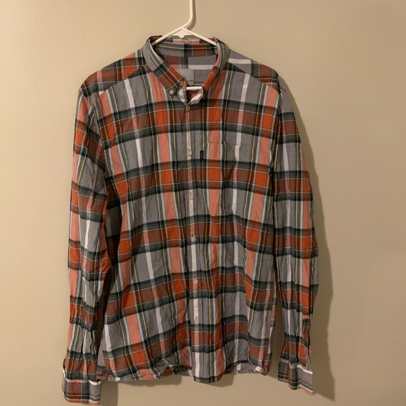 Gray and orange plaid with brown, green and yellow. Light fabric. Made in Sweden.