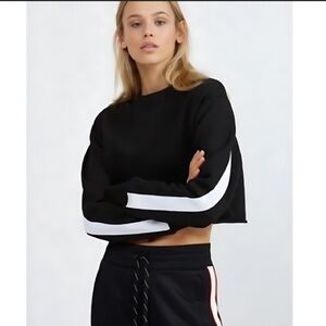 The Wesley Hudson Stripe Sweatshirt is a stylish and comfortable pullover with a modern, sporty aesthetic. It features a cropped silhouette, making it a trendy choice for casual wear. The bold horizontal stripe pattern gives it a distinctive and eye-catching look,