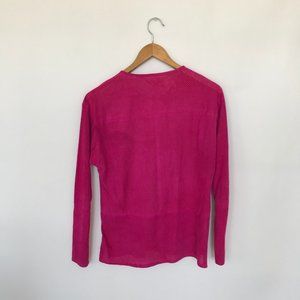 This is such an unusual piece! Soft 100% lamb suede top has four buttons in front, long sleeves, and it's skirted on bottom with vents on each side. I believe it's meant to have a loose fit to be worn over another top or cami. The color is a nice dark pink, not quite magenta. The tag marks it size medium. The brand is West Bay Sport Leathers for Saks Fifth Avenue. There's a small black smudge on one inner sleeve, not very noticeable.
