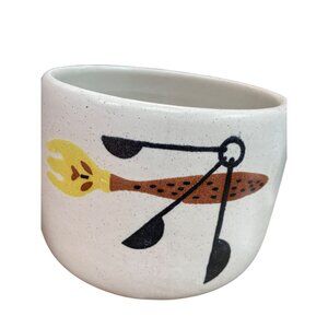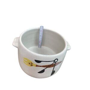 This West Bend stoneware casserole pot, crafted in the US, embodies mid-century charm. Its speckled design and colorful utensil motif offer a vintage aesthetic, making it a sophisticated addition to any kitchen collection. Sturdy stoneware construction ensures durability while the snug lid helps maintain heat during serving. No cracks or chips in very good condition with no defects noted. SKU 9320