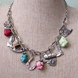 This handmade set includes a silver necklace with silver charms and genuine stones attached.