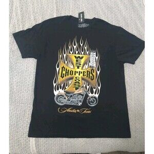 The West Coast Choppers Flame shirt in size Large is a black motorcycle-themed T-shirt made of cotton. This graphic print shirt features a design that is perfect for any season, whether it be winter, summer, fall, or spring. With short sleeves and a regular fit, this shirt is ideal for men who appreciate a rugged and edgy style inspired by motorcycles. Ideal for casual wear, this shirt is a stylish addition to any wardrobe for fans of the brand and motorcycle enthusiasts alike.