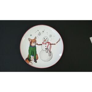 West Elm Rachel Kozlowski Dapper Animal Winter Fox Snowman Plate Salad/ Dessert/Luncheon. 8.5" diameter. Fox in sweater and snowman. Decorated with snowflakes and red trim on border. In very nice pre-owned condition. No chips cracks or stains.