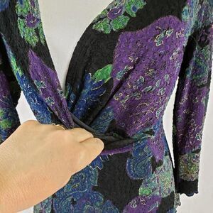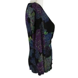 This black top has a multicolored floral design, mixed with metallic threads, 3/4 sleeves, extra wide arm openings, has scalloped edges and a split on the neckline, down to the waist (pic 5)