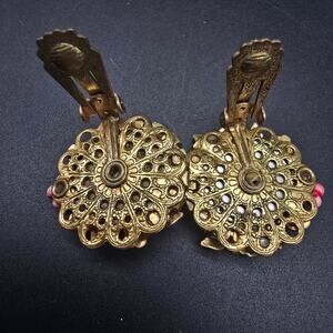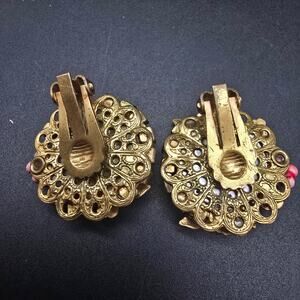 West Germany Pink Gold Tone Clip On Earrings Rhinestone Ornate Vintage