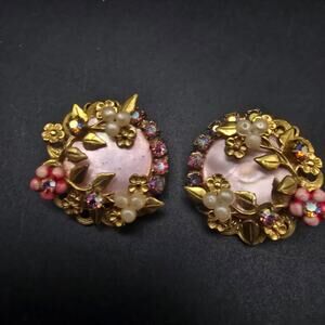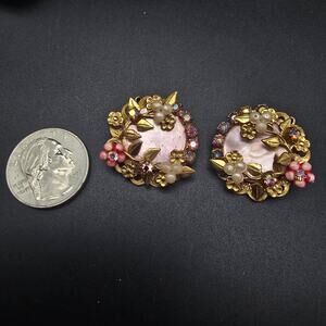 These vintage clip on earrings feature pink mother of pearl shell discs with and gold leaves and pink rhinestones, flowers and faux pearl accents.