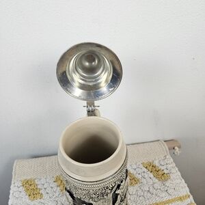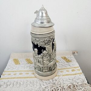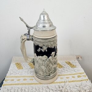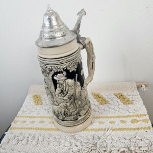West Germany Stoneware Beer Stein cobalt Blue and Gray Hunting Scene ~Pewter Lid