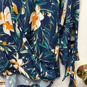 This floral top by West K has 3/4 sleeves that tie. It is a faux wrap style with the back of the shirt being longer than the front. It is in excellent condition and a size large.