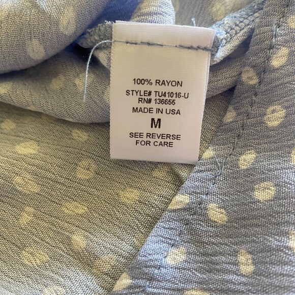 NWT West K (by Stitch Fix) blouse, women’s medium, USA made, 100% rayon. V-neck, flutter sleeve, tie front detail at hem, rounded back hem, light crinkled gauze fabric, periwinkle with white imperfect polka dots.