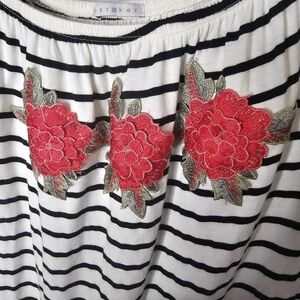 West Kei Red Black White Floral 1/2 Bell Sleeves Tunic Shirt Blouse Size L Large