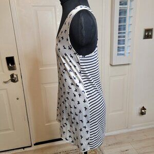 Fun and functional, this West Kei reversible tank top offers two looks in one—the front side features a playful navy dog print on a white background, and the back a timeless navy-and-white stripe pattern. Crafted in a soft, lightweight knit with a flattering scoop neckline and racerback cut, this size small tank is perfect for warm-weather layering, lounging, or casual outings. A versatile piece with a touch of whimsy.