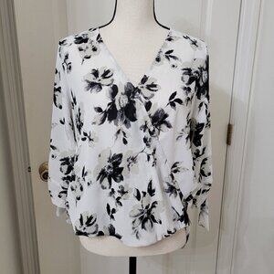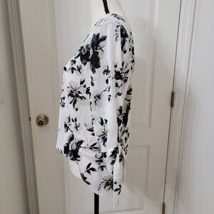 West Kei Size S White w/ Black and Gray Floral Bubble Hem Blouse, Excellent Used Condition. No Holes, Rips, Stains or Snags. Faux Wrap Style. 3/4 Sleeve with Tie Cuffs. Please refer to measurements in photos to ensure proper fit.