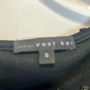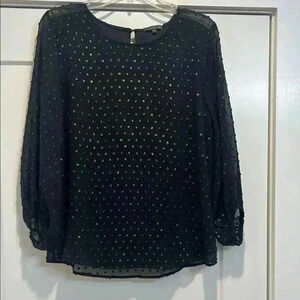 West Kei black and gold blouse size small in perfect condition! This is the perfect blouse for the holidays! It’s very classy and would look great with dress pants, skirt or even jeans! It is lined, but the sleeves are sheer. It has elastic sleeves and has a key hole opening in the back.