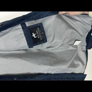 Navy quilted snap front jacket with brown corduroy and leather-like accents throughout. Finish on snaps make them appear to be wood, although they are metal. Collarless. Two front slash hip pockets. One exterior and one interior chest pocket. Freshly cleaned and steamed. Excellent condition - no flaws.