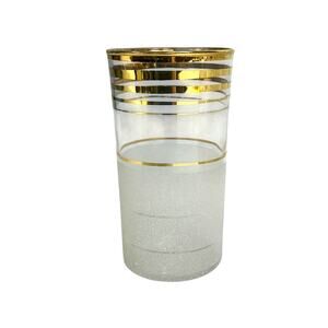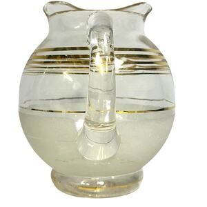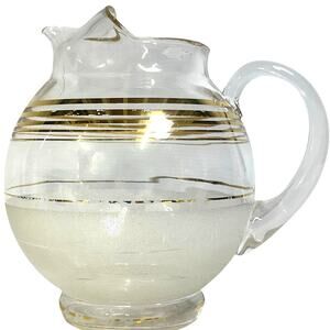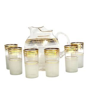 Elevate your cocktail or lemonade experience with this stunning vintage West Virginia Glass Frost Nip Ball Cocktail/Lemonade Pitcher and glass set! Crafted in the 1950s, this set exudes retro charm and sophistication. A frosted base with gilded bands on both the pitcher and glasses make an elegant addition to your entertaining serve ware or barware. The measurements are: Pitcher: 8.5"H x 7" in diameter Glasses: 4.75"H x 2 5/8" in diameter The pitcher features a unique ice lip that holds back ice and makes it easy to pour your drinks, while the six included glasses are perfect for sharing your favorite drinks with friends and family. The set is in very good to excellent condition. Note: There is some wear on the gold bands on one side of the pitcher and some of the glasses consistent with age and use. See pictures to determine/verify details and condition. This vintage set is sure to be a conversation starter and a cherished addition to your home bar. Don't miss out on the opportunity to own a piece of mid-century glassware history! Add this West Virginia Glass cocktail set to your collection today. # 5167