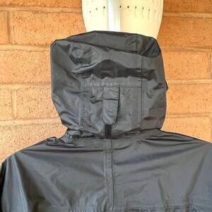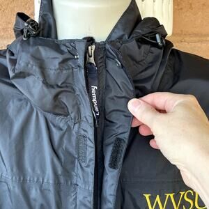 Landway Men's Monsoon performance outerwear zip up jacket with aquavent technology. Seam sealed rain wear treated with durable water repellent provides protection against both the wind and cold rain. Packable, breathable and lightweight. WVSU embroidery on left chest of this brand new jacket. Hook & loop closure on wrists and zip vents on sides. Drawstring at waist and neck26". Hood rolls up.