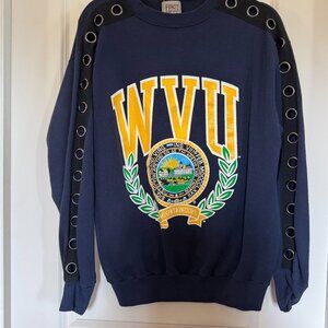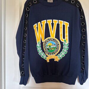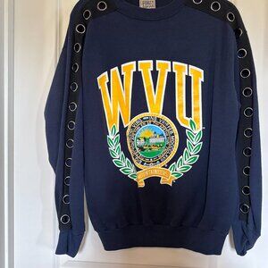 The West Virginia University Mountaineers Vintage Sweatshirt by Furst of a Kind is a unique and stylish piece perfect for any fan of the team. Made with a comfortable cotton lining, this solid blue sweatshirt features a crew neck and long sleeves, making it ideal for winter, fall, and spring seasons. The pullover style and grommet accents add a touch of fun and nostalgia to this one-of-a-kind garment. It is machine washable and available in size L for women who want to show off their team pride in a trendy way.