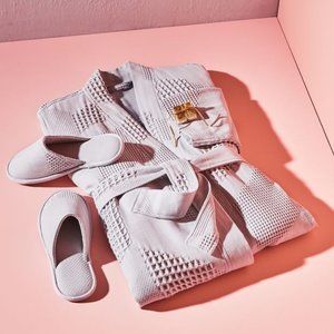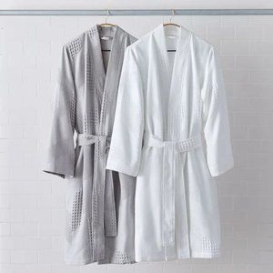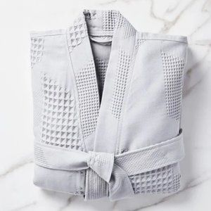 Beautiful luxury robe, great for a christmas gift. Light grey color. Wrap up in the softness and comfort of our classic spa waffle-weave robe, upgraded in pure organic cotton. This unisex robe is a medium-weight, year-round robe that quickly absorbs moisture from the shower. With tailored detailing like a shawl collar, inseam pockets, belt and two loops for adjustable belt height, and a loop for hanging. 100% organic cotton—a healthier choice for your home and the environment. Inseam pockets; belt + two belt loops on each side; back hook loop for easy hanging. LARGE Robe body length: 48"l. Shoulder to shoulder: 19.8"w. Chest: 51"w.