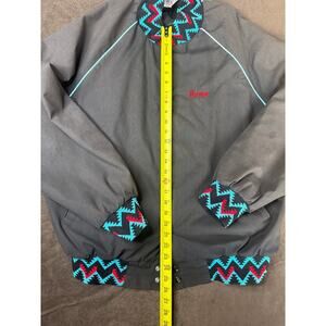 Vintage WestArk jacket made in the USA, size 2XL. This standout piece features bold Southwestern/Aztec-inspired patterning in red, turquoise, and black along the sleeves, collar, and hem. Made from a cozy polyester and cotton blend, it’s warm, durable, and full of character.