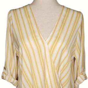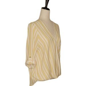 West Kei Allen Yellow Stripe Surplice High-Low 3/4 Roll Tab Sleeve Blouse