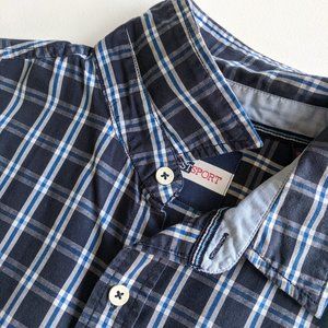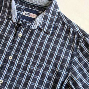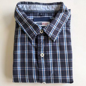 West Sport short sleeve casual button down shirt. Navy, royal blue, and white plaid. Left chest patch pocket. Small pinholes under collar and one sleeve, pictured.