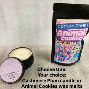 -1 candle or bag of wax melts (your choice: Cashmere Plum candle or Cotton Candy Animal Cookies wax melts)