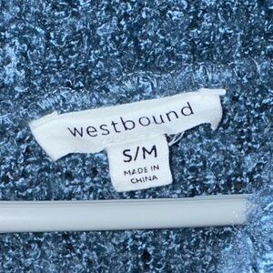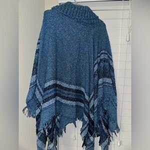 Embrace a relaxed style with this Westbound poncho sweater in a soothing blue hue. Featuring a turtleneck design and a plaid-like pattern near the hem, this piece is both cozy and chic. The fringed edge adds a bohemian touch, making it perfect for casual outings. EUC