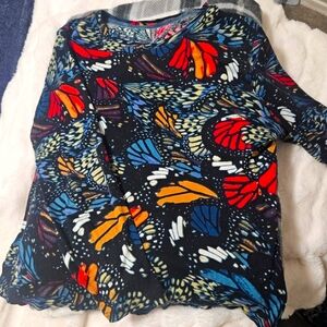 Vibrant top with a colorful pattern. Features a butterfly design. Perfect for adding a pop of color.