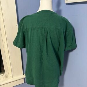 This relaxed button down shirt by Westbound features a vibrant green hue and a mandarin collar, offering a stylish and comfortable fit. Its buttoned design and short sleeves make it perfect for casual outings or warm-weather occasions.