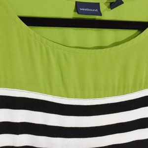 Gently worn, green decollete with black and white striped torso with light roching at bust. Poly/cotton/modal blend