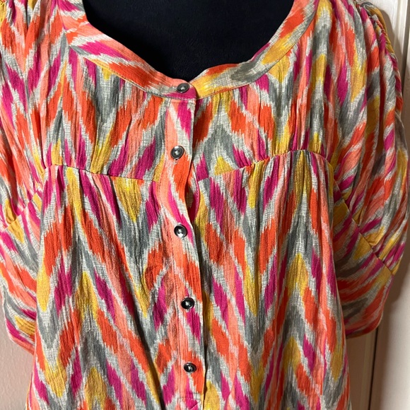 Bright blouse with bold patterns. Features orange, pink, and gray hues. Ideal for a vibrant look.