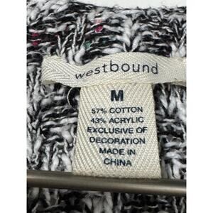 This Westbound black and white cardigan is a great layering piece for a cozy yet chic look. It features a unique chevron knit pattern with colorful embroidery detail along the neckline and front opening. The hem is finished with a fun, tasseled fringe. Made from a blend of cotton and acrylic, it is lightweight and comfortable. This versatile open-front cardigan is a size medium.