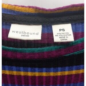 Westbound Petite Small Ribbed Stripe Shirt Long Sleeve Boat Neck Dark Multicolor. This cute Long Sleeve shirt has stretch so it is very comfy. It is a Petite Small. The inside side tag is missing, but the back tags are both there. Please ask if you need measurements. Please see pictures for more details.