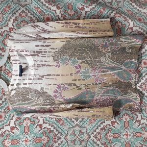Hand wash only. Freshly hand washed. Blend of 60% polyester, 36% rayon, and 4% lulex. Some glitter within material. Small pull in material just below center of front neckline.