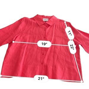 Westbound Petites linen shirt in a vibrant red color. It features a classic collared design with a button-up front closure. The shirt has three-quarter sleeves with buttoned cuffs and a relaxed, boxy fit. The fabric is 100% linen, providing a lightweight and breathable feel. The shirt measures approximately 22 inches in length, 21 inches in width, and 19 inches across the shoulders. It has a standard collar and a straight hemline. The shirt It comes without tags