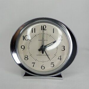 This Alarm Clock by Westclox features a classic design. This wind-up alarm clock has a mechanical movement and an analog dial. This collectible piece is perfect for anyone looking to add a retro touch to any room in their home. With its oval shape and vintage appeal, this alarm clock is a charming addition to any decor, especially for those who appreciate mid 20th century design aesthetics.
