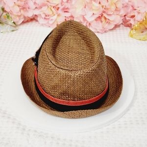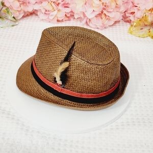 Westend Fedora Woven Paper Braid Mesh Tan Hat Size Small/Med Black Band Feather