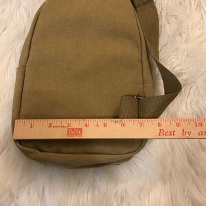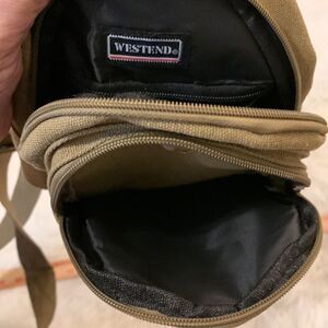 Westend sling bag crossbody with adjustable strap. Could also be ladies. Excellent quality and the color is olive green but looks tan in photos. Like new condition & smoke free/pet free home. See photos for complete description/details.