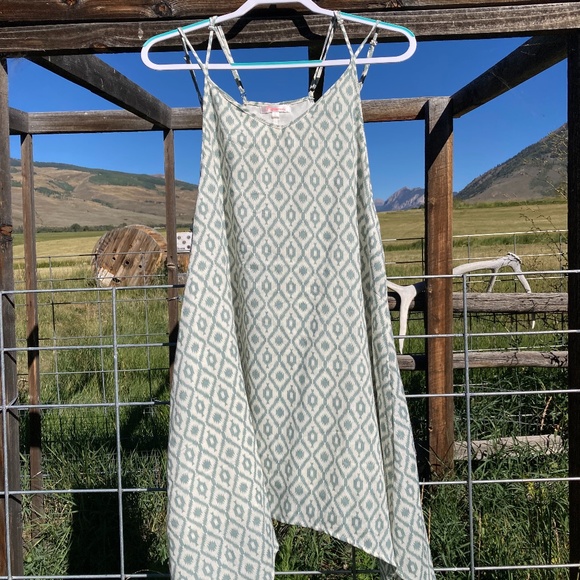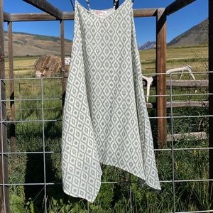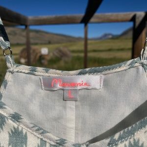 White and turquoise Aztec Western Pattern, spaghetti strap, loose and flowy fit. 100% Rayon with 100% Polyester lining.