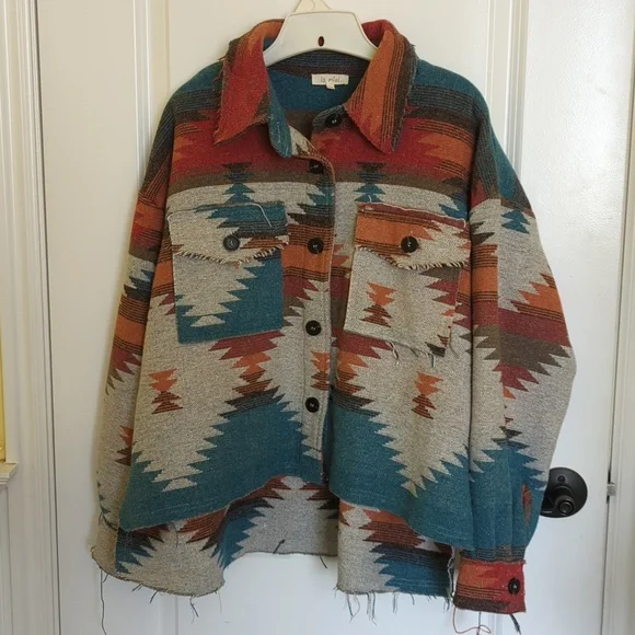 Super cute western shacket with an aztec design. Has only been worn a handful of times and is in perfect condition. Has an oversized fit and is longer in the back. It is thicker material and way soft. ❤️